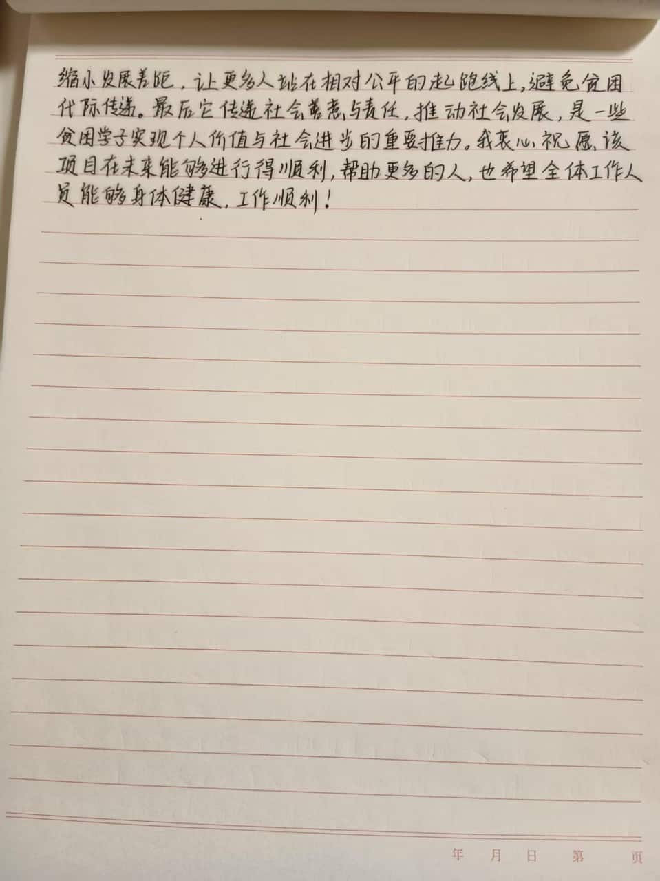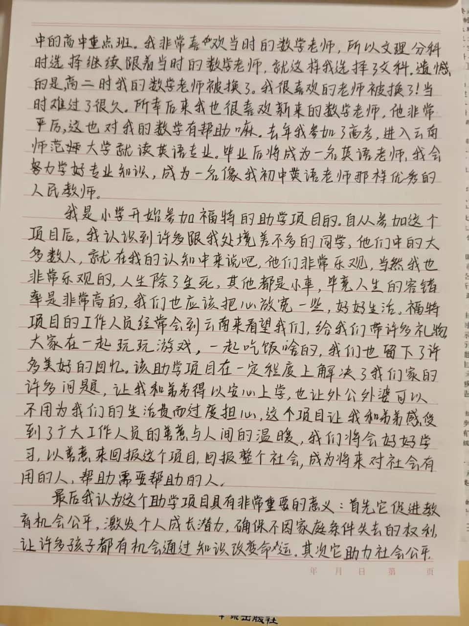 This choice reflects both her passion for English and her thoughtful consideration for the future—to illuminate the path of knowledge for herself and for countless other children like her. Guo Rong aspires to be like her junior high English teacher, communicating with students in a calm and effective manner, tailoring her teaching to their individual needs, and sowing seeds of hope in their hearts. Becoming an excellent teacher is her most humble yet resolute goal.