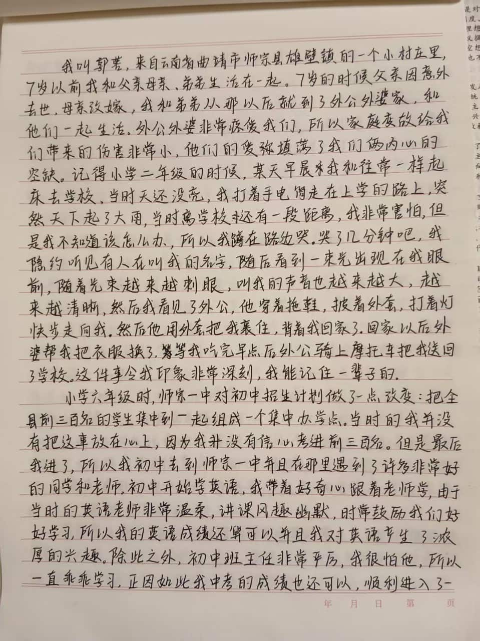 After primary school, she was admitted to Shizong No. 1 Middle School, the best in her county, ranking among the top 300 students. It was there she met a teacher who would profoundly influence her life. Her junior high English teacher's humor and gentle guidance not only sparked her deep interest in English but also planted the dream of becoming a teacher in her heart.
