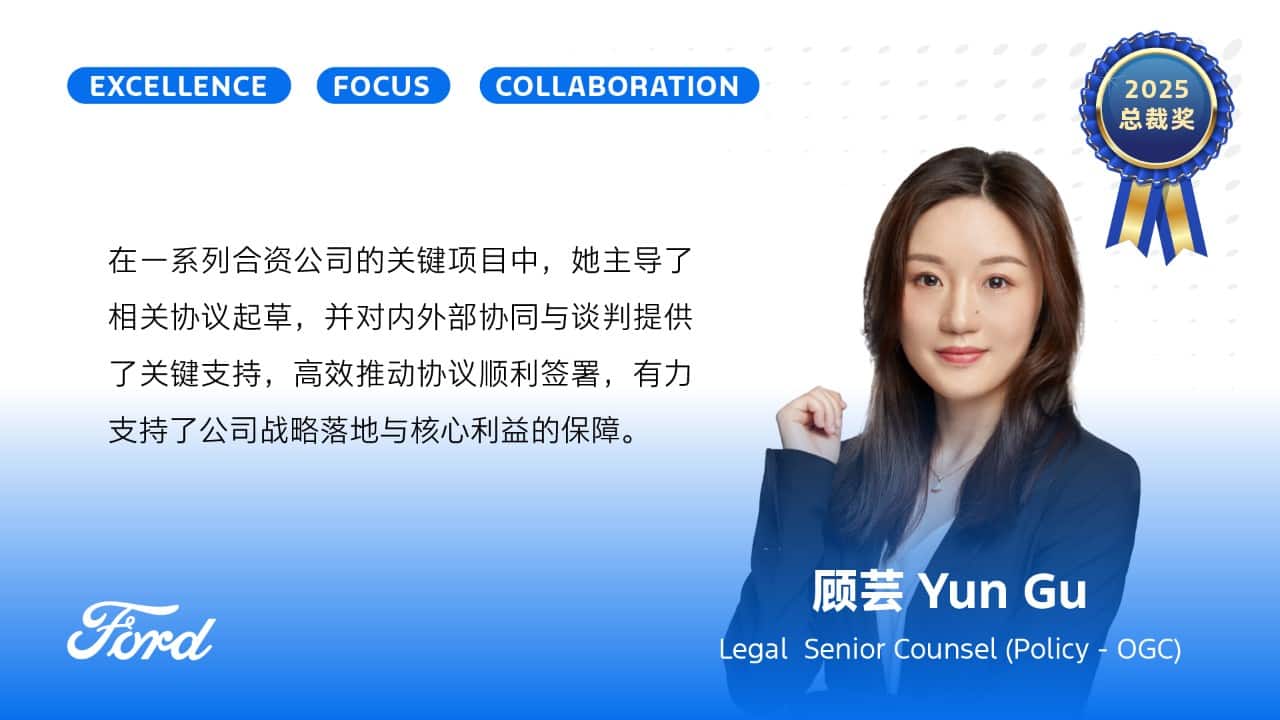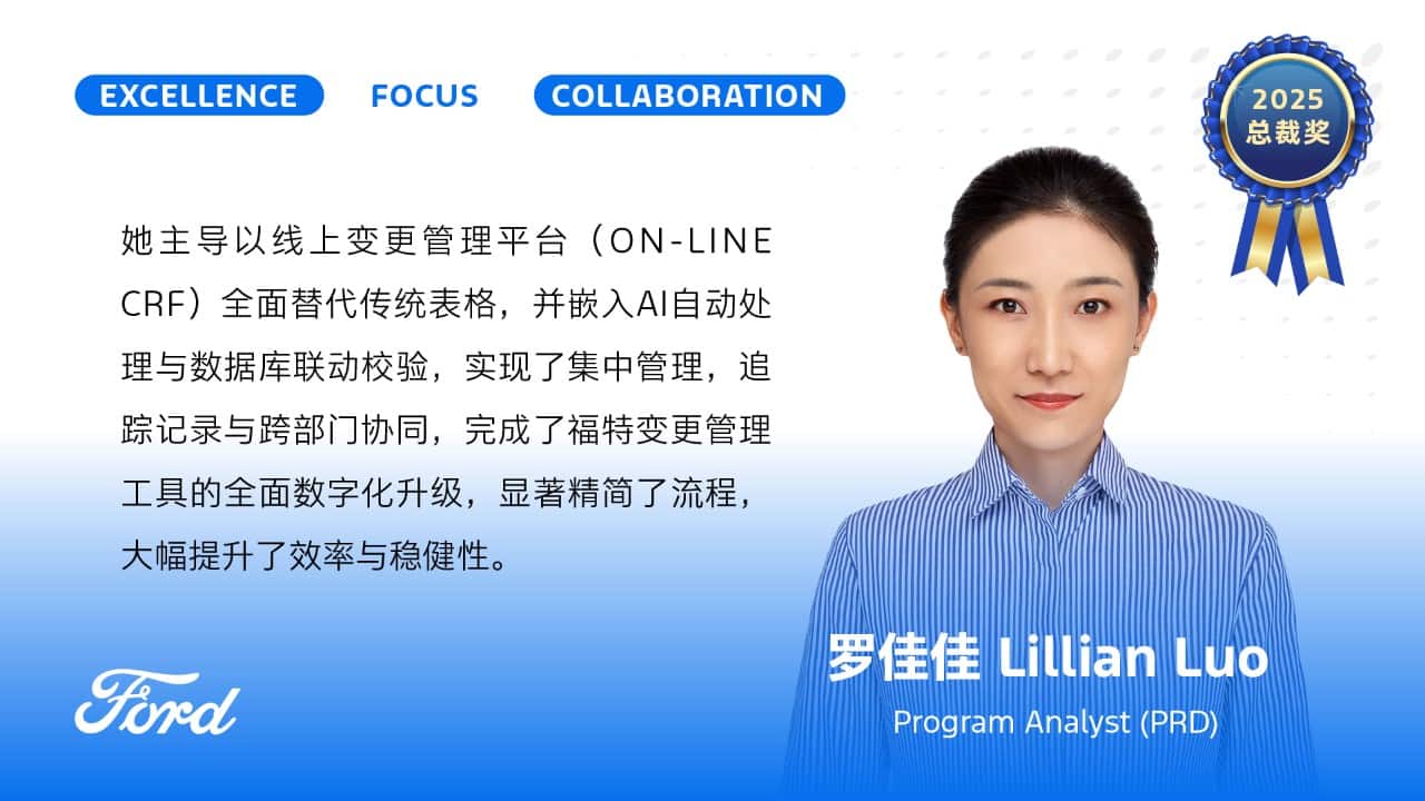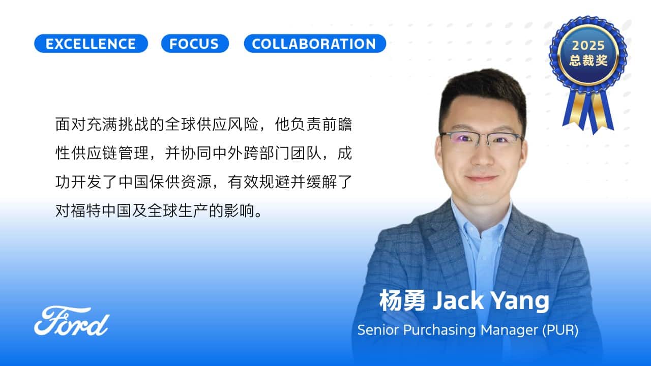 Established in 2021, the Ford China Employee of the Year Award recognizes employees across the organization who have made outstanding contributions over the past year. It celebrates individuals who fully embody the principles of the Ford OS behaviors: Excellence, Focus, and Collaboration. The final winners were selected through a rigorous process involving departmental nominations, company-wide open voting, and expert panel reviews.